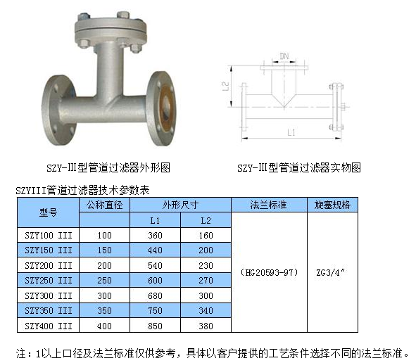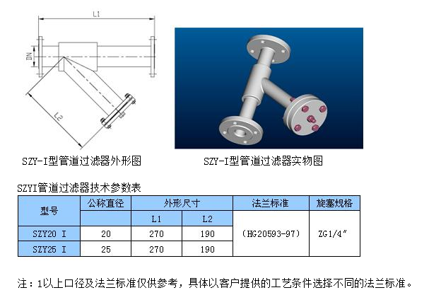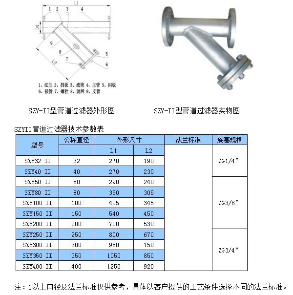 SZY系列管道过滤器是石油化工等输送管线上必不可少的设备,具有结构紧凑,使用方便,过滤能力大,压力损失少,安全可靠,价格低廉等优点。本产品规格齐全,适用性强。若将它装在泵的入口或系统管线有开关的部位,既可延长泵及一系列设备的使用寿命,又能保证整个系统安全稳定地运行。Y型过滤器主要有以下几种规格: