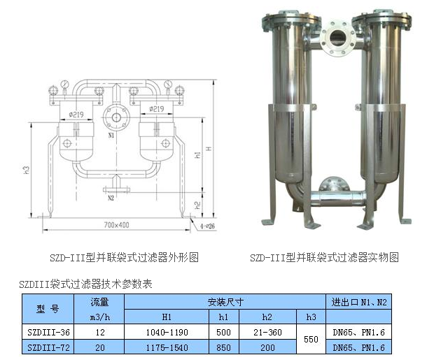 SZD-III型并联袋式过滤器是由两个过滤单元并联而成,可根据需要,每个过滤单元的进出口装一套阀门,两个过滤单元之间可切换,避免了单个过滤系统需要停机的弊端。