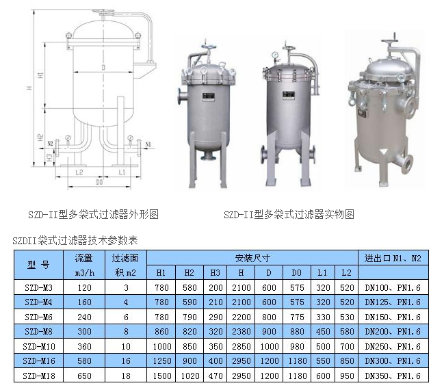 SZD-II型多袋式过滤器是一种高精度的过滤装置,其工作原理和单袋式相同,但处理量大,主要用于大型过滤系统,多袋式过滤器,内部设置多个过滤袋,设备上部大法兰链接,可打开清理过滤杂质。