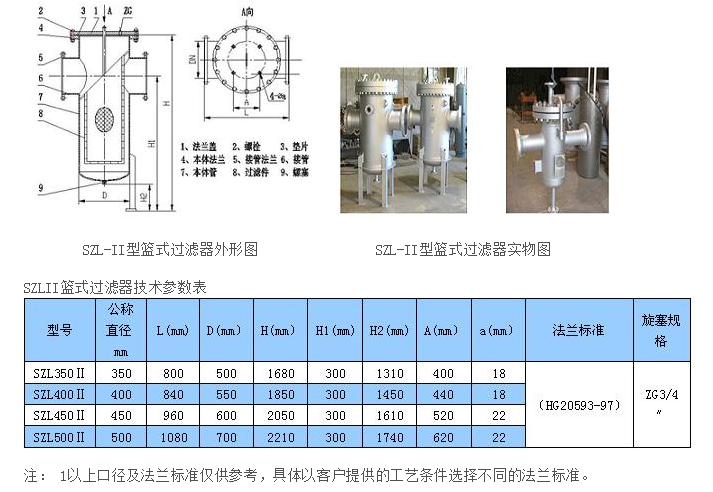 SZL-II型篮式过滤器进口与出口在同一水平线上,底部为椭圆封头结构。过滤器上部可打开取出过滤网进行清洗,底部设有排污口,可排放尽过滤器内介质。