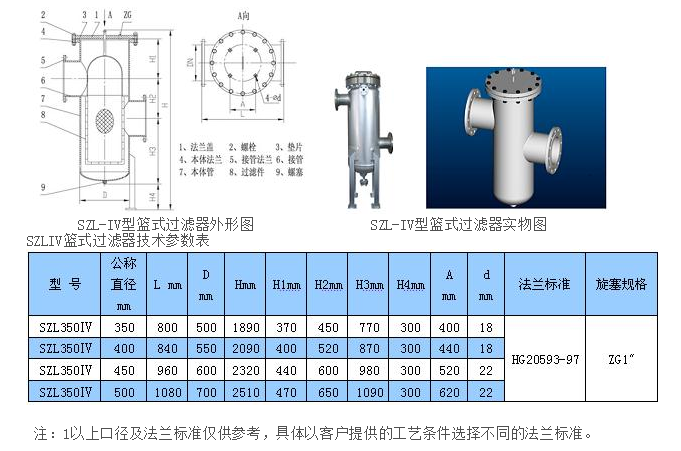 SZL-IV型篮式过滤器进口与出口不在同一水平线上,底部为封头结构。过滤器上部可打开取出过滤网进行清洗,底部设有排污口,可排放尽过滤器内介质。
